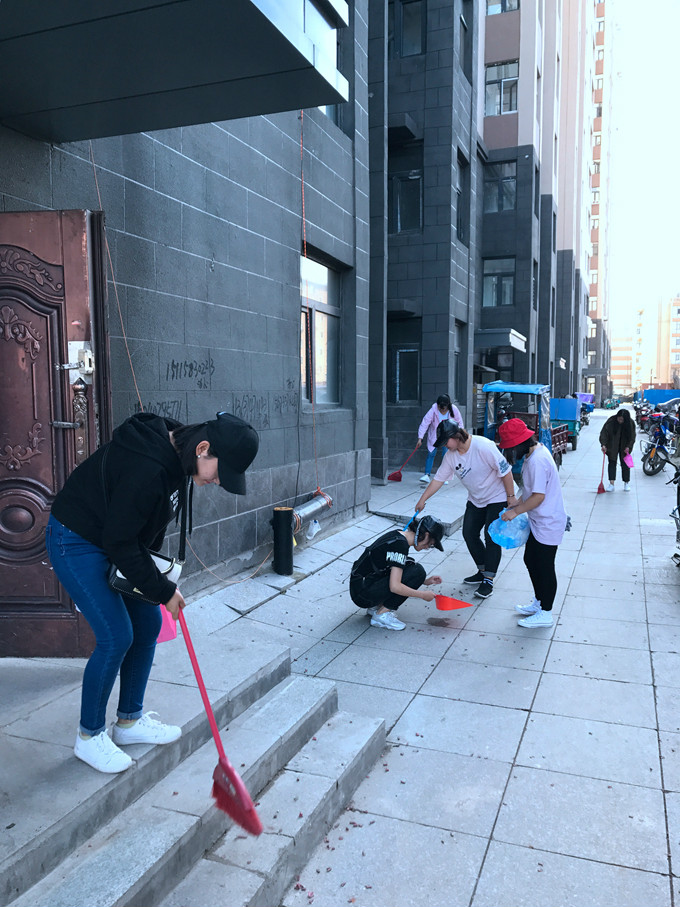 下午,在团委副主席带领下志愿者们准时到达了学校附近的小区,开展了志愿服务,同学们用自身的绵薄之力仔细认真地清理了小区的甬路以及草坪,天气再冷也阻挡不住同学们心里的热情。