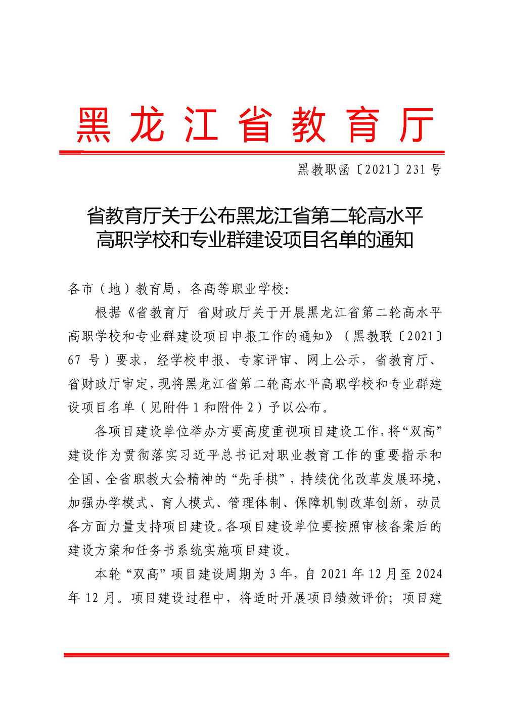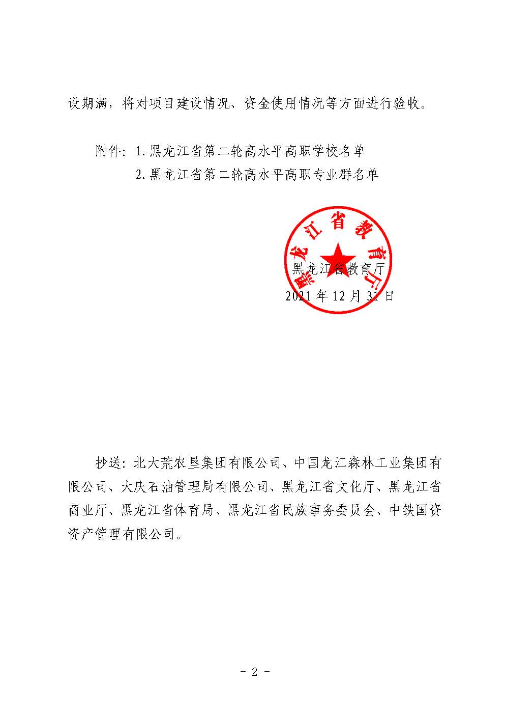 黑龙江省教育厅关于公布黑龙江省第二轮高水平高职学校和专业群建设项目名单的通知