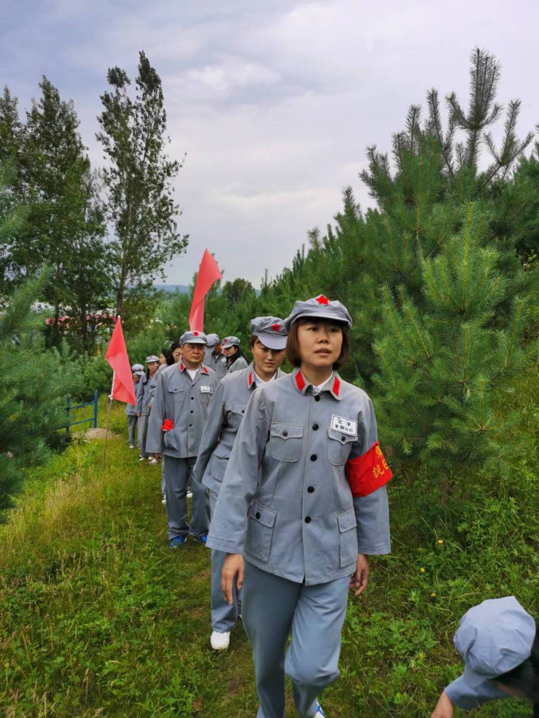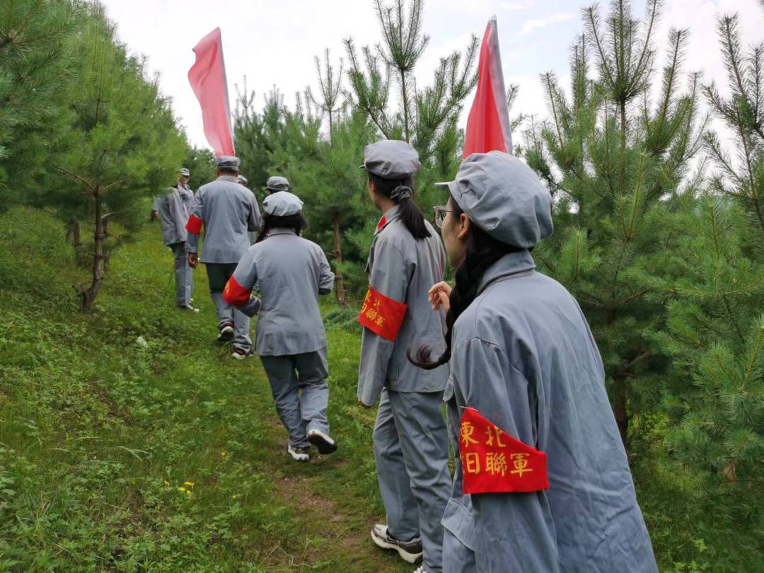 随后,党支部全体党员换上红军战士服装来到英雄山,开展重走抗联路活动。在登山的过程中,党员们发扬不怕困难、不畏艰险、坚韧不拔、敢于攀登的精神,到达了东北抗联纪念碑所在的英雄山顶峰。