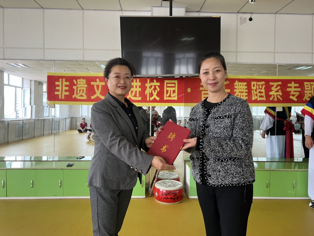 音乐舞蹈系主任禹海燕为两位专家颁发客座专家聘书。白馆长表示,双方的合作充分体现校企合作,校企共融,相信通过合作能更好的带动双方师生在教学上的提升,培养广大师生对“非物质文化遗产”传承和学习的兴趣。金光烨老师为师生现场讲解长鼓的构造、基本坐姿、鼓槌鼓鞭的拿法和长鼓敲击的基本方法,并现场示范、指导学生演奏。
