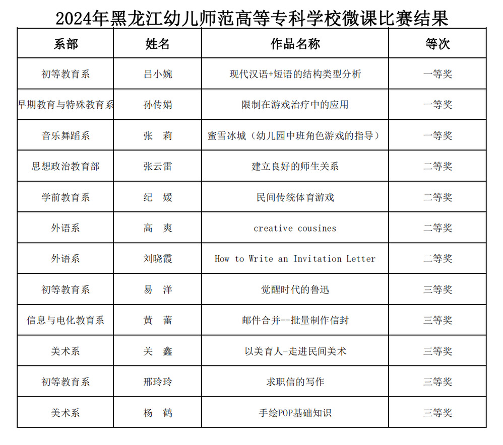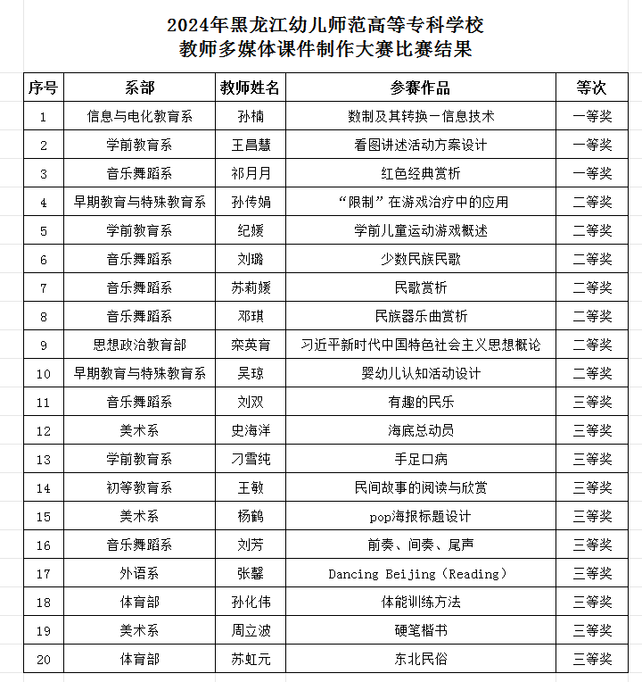 5月17日,2024年黑龙江幼专教师多媒体课件制作、微课大赛经过精心组织,如期举行。本次大赛经过系部推荐遴选,入围校赛多媒体课件作品21个,微课作品12个。经过评委公平公正地评审,评出多媒体课件制作大赛一等奖3项、二等奖7项、三等奖11项;微课大赛一等奖3项、二等奖4项、三等奖5项。按照黑龙江省高校师资培训中心下发的《关于举办第十一届黑龙江省高校青年教师多媒体课件制作大赛的通知》《关于举办第十一届黑龙江省高校微课教学比赛的通知》要求,推荐获得多媒体课件制作和微课大赛一等奖的作品参加省赛。现将学校比赛获奖结果公布如下: