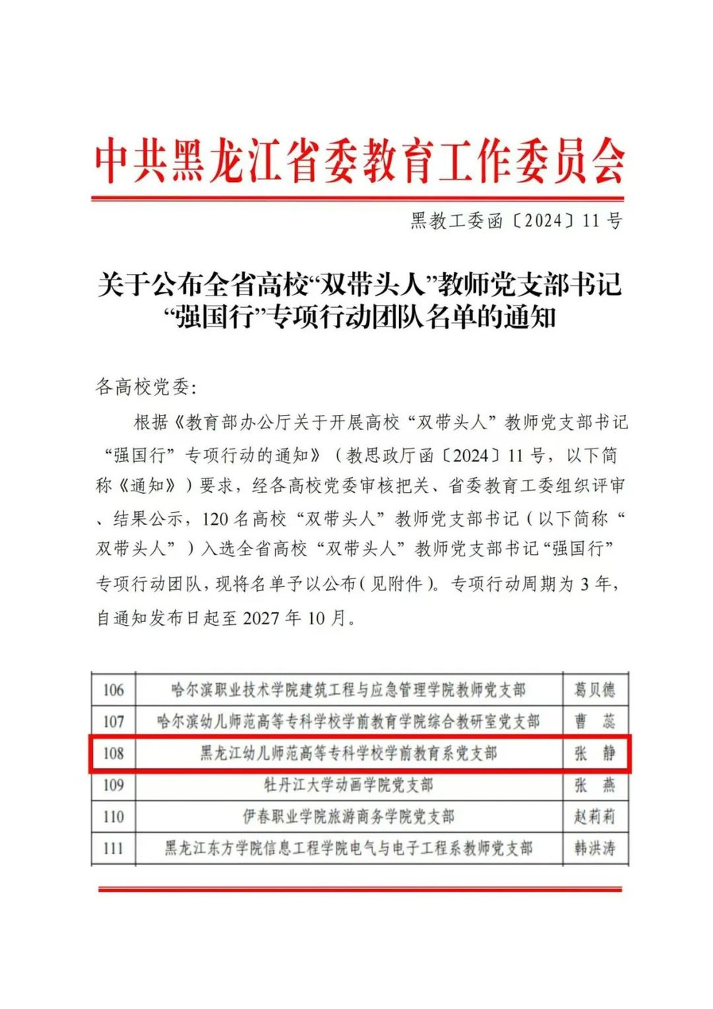近日,中共黑龙江省委教育工作委员会发布了关于全省高校“双带头人”教师党支部书记“强国行”专项行动团队遴选结果的公示,学前教育系党支部成功入选。