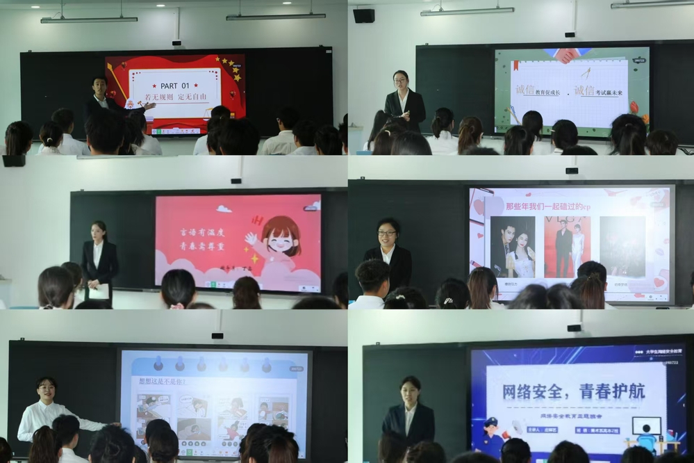 新入职辅导员主要围绕树立规则意识、网络安全教育、诚信教育、时间管理、人际交往与沟通、文明恋爱等紧贴学生思想实际的热点议题开展主题教育,在主题立意、内容设计、教育方法、互动形式等方面精心设计。班会亮点纷呈,直击学生成长核心议题,充分展示出辅导员的专业素养和积极向上的精神风貌。