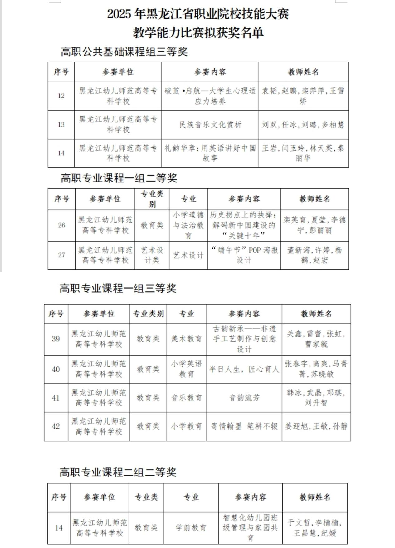 2025年黑龙江省职业院校技能大赛教学能力比赛二等奖3项、三等奖7项