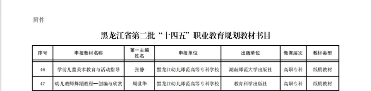 近日黑龙江省教育厅公布了黑龙江省第二批“十四五”职业教育规划教材52种(部)。周世华主编的《幼儿教师舞蹈教程—创编与欣赏》、张静主编的《学前儿童美术教育与活动指导》成功入选。